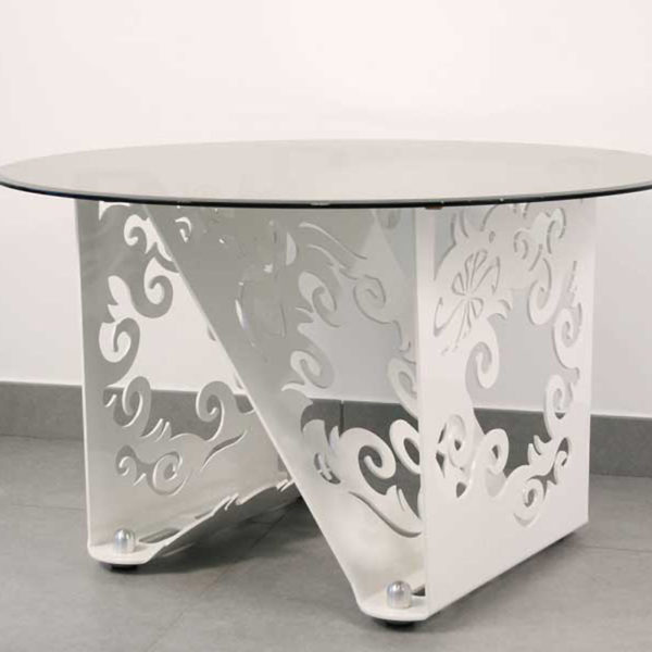 Tavolo Design in metallo verniciato – è realizzato in METALLO VERNICIATO E CRISTALLO RIFLETTENTE GRIGIO interamente PRODOTTO IN ITALIA con la tecnologia del TAGLIO LASER E del TAGLIO AD ACQUA . La durevolezza del materiale e la pregiata finitura testimoniano un artigianato MADE IN ITALY.